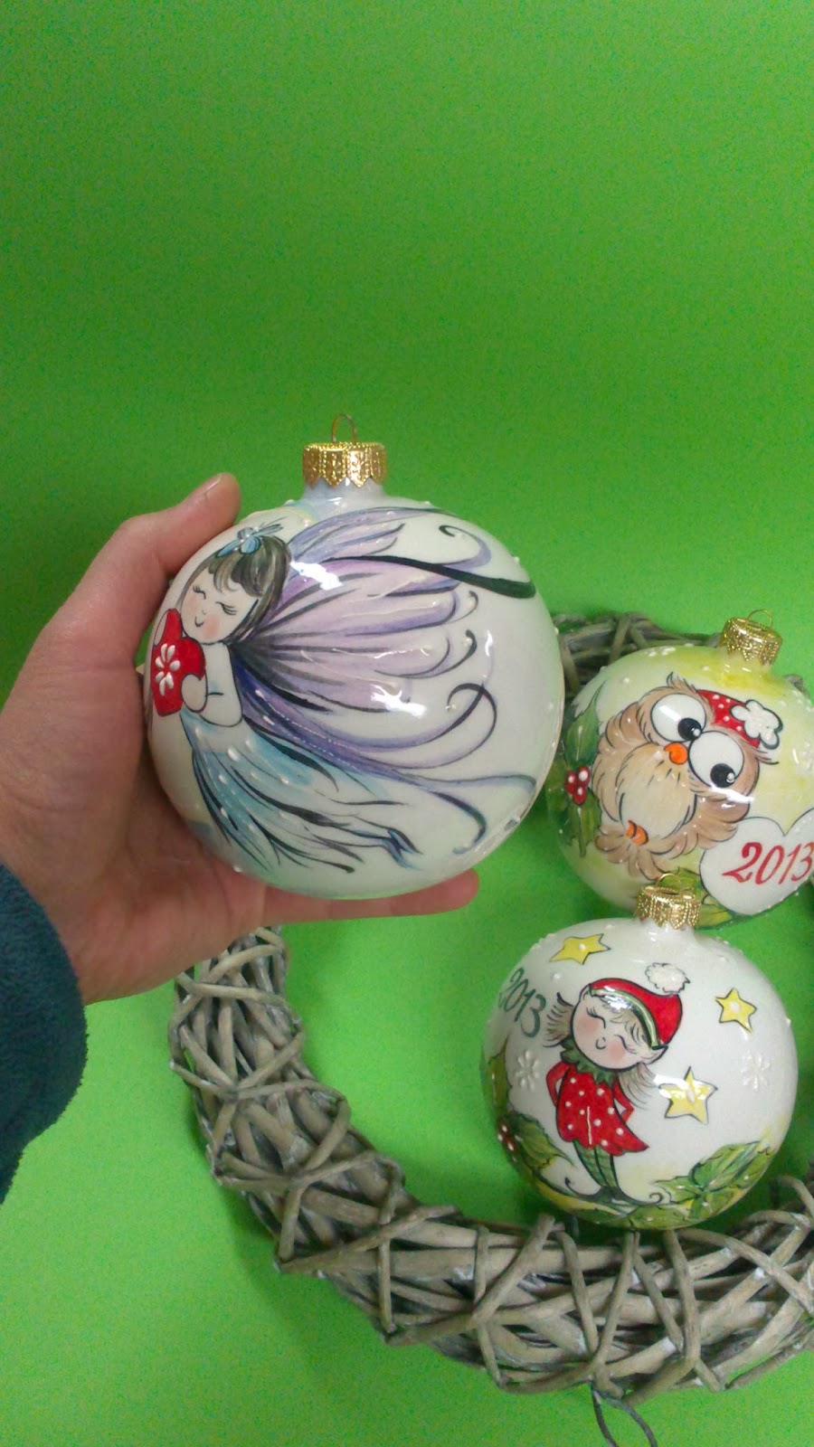 Palline di Natale in ceramica da collezione. Folletta e Sacra Famiglia.